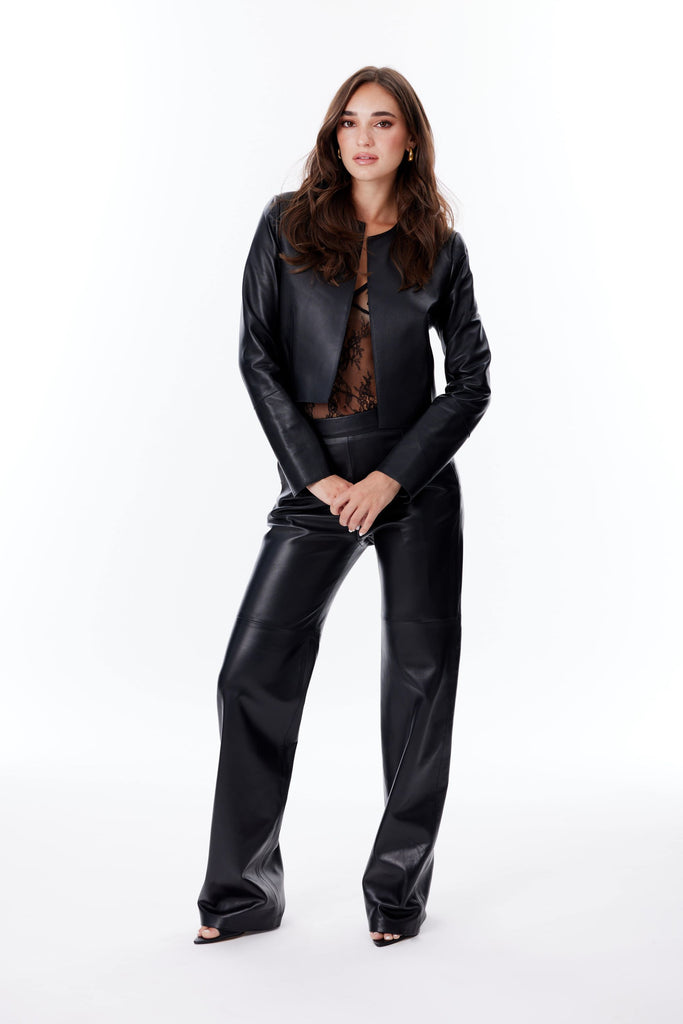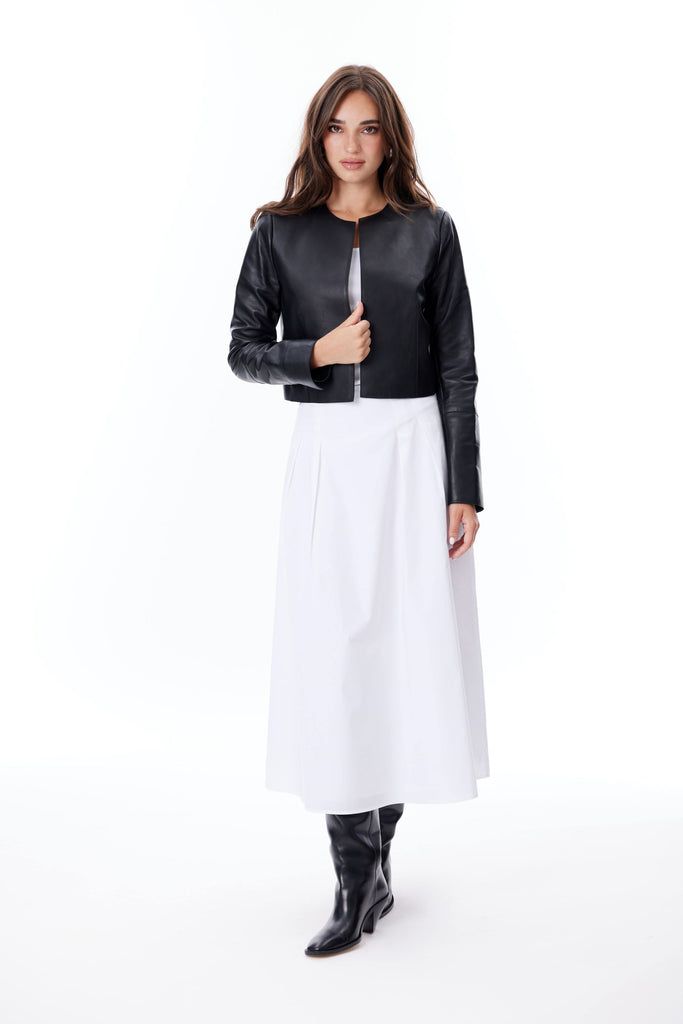 Versatile and chic, this leather jacket offers instant sophistication. Layer over sleeveless dresses for extra coverage or pair with trousers for a sleek office look. With its refined silhouette and contemporary cropped length, this jacket adds a polished finish to any look. Roll up the sleeves to reveal a hint of leather underneath for added flair. Made of soft nappa leather and endlessly stylish – our Essential Cropped Jacket is the ultimate wardrobe essential you'll never want to be without.
