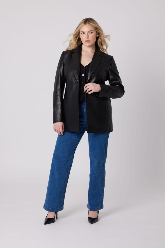 Grab it whenever you are heading out. Whether paired with jeans, skirts, or dresses, this blazer adds instant sophistication and edge to any outfit. For a bold statement, mix and match with our leather trousers for a modern suit ensemble. Both cool and stylish, our Oversized Nappa Leather Blazer is a must-have for every wardrobe. It was designed for an oversized fit. Please use the sizing app to help find your perfect size.