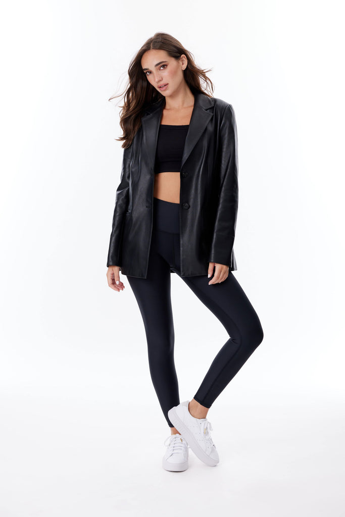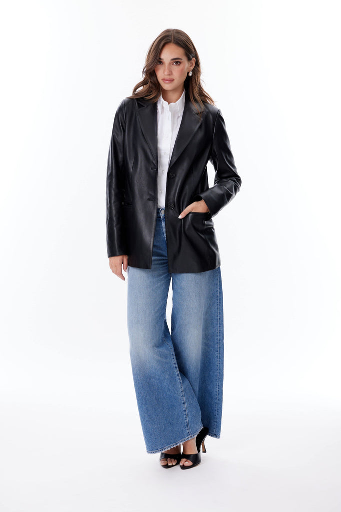 Crafted from luxurious black nappa leather, this blazer effortlessly blends style with practicality. Its oversized silhouette makes it the perfect piece for both casual outings and chic occasions.