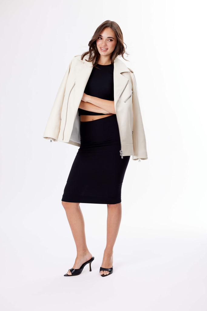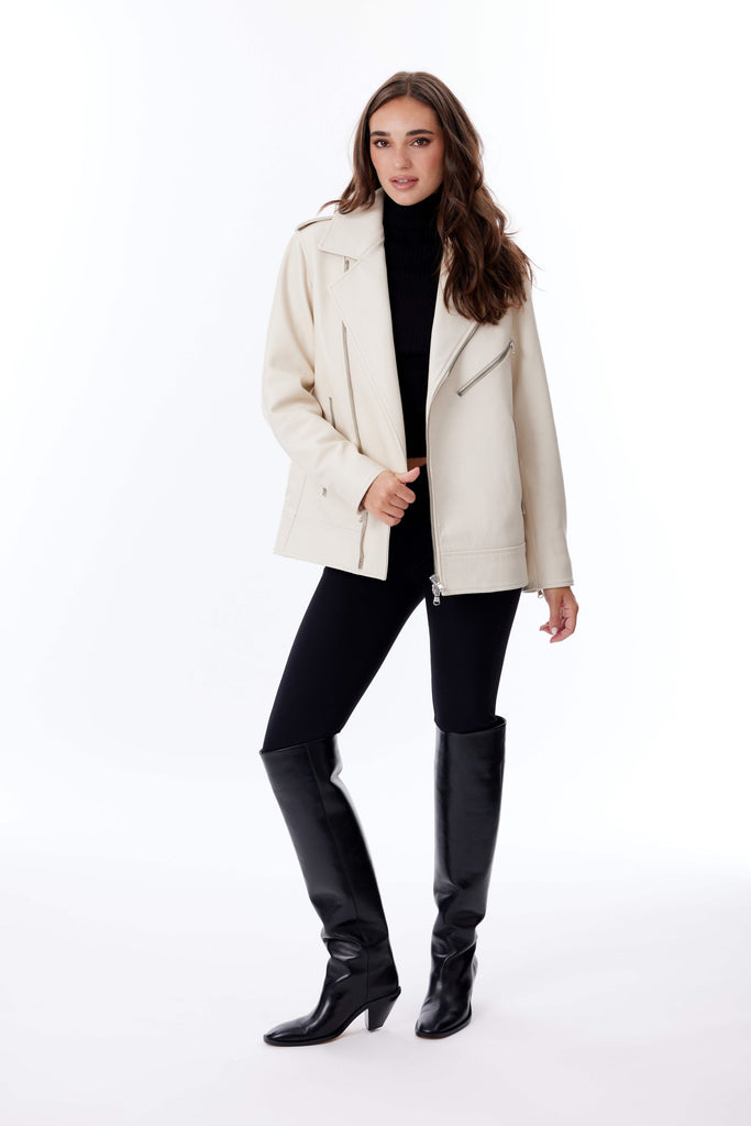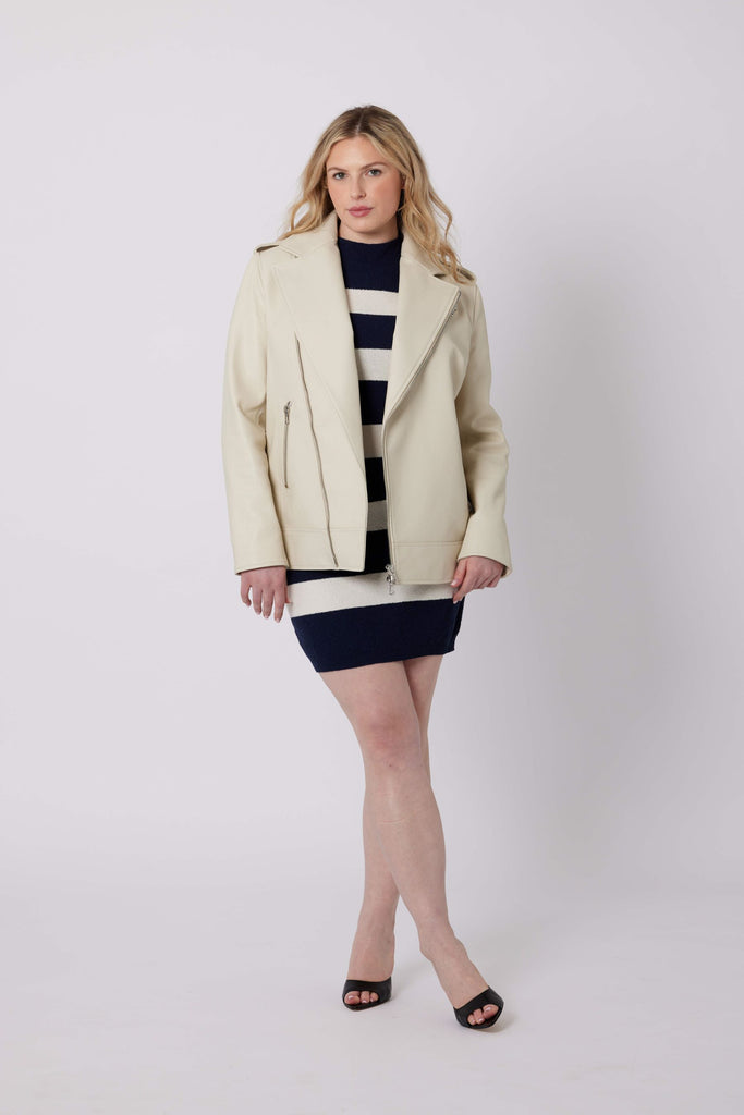 This is your go-to jacket for everyday style. Designed with an oversized silhouette, it effortlessly layers over heavy sweaters for warmth or adds edge to casual jeans-and-tee ensembles. Its elongated length offers ample coverage, perfect for elevating athleisure looks. Versatile and timeless, this moto jacket is a wardrobe staple, seamlessly complementing every style from day to night. This piece was designed to be oversized. Please use the sizing app to help find your perfect fit.